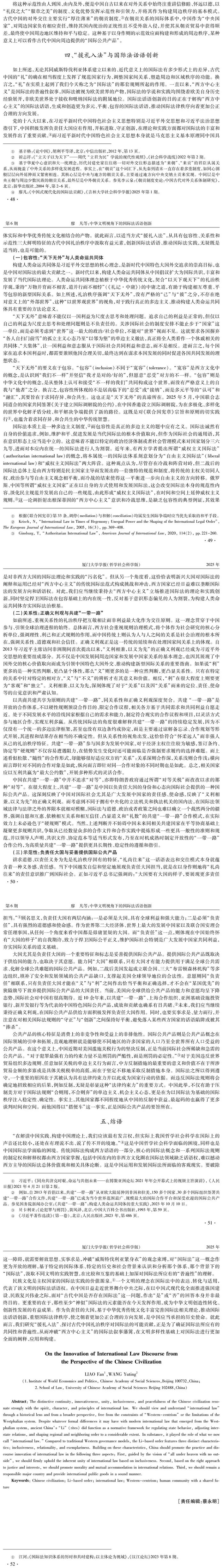 中华文明所具有的突出的连续性、创新性、统一性、包容性及和平性,同国际法的精神、气质和原则高度契合。以历史的眼光和更加宽广的视角来看待和认识“国际法”,才不会受制于“西方中心主义”或者局限于威斯特伐利亚体系。无论与近代意义上的国际法有多少形式上的差异,古代中国的“礼”的确在相当程度上发挥了规范国家行为、调整国家间关系、塑造周边和区域秩序的功能,在实质上起到了今天被称之为“国际法”的那些规则所起的作用。相较于西方传统治理模式,礼治秩序具有包容性,关系性和示范性三大鲜明特征。中国应当基于这些特征,秉持“天下无外”理念捍卫国际法在包容基础上的内在统一性,以正确义利观为指引在国际关系中推崇道义和礼让,出于负责任大国的身份和立场妥善提供国际公共产品,从而推动国际法领域的实践发展与话语创新。